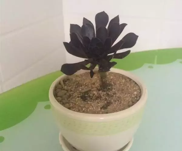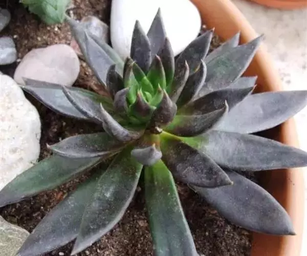 古紫和黑王子有点像,但其叶片更尖,株型更大,叶片叶宽倒披针形,尖端锐利,叶色绿色到黑色,通常黑色,株型较大。古紫春末夏初开花,聚伞花序腋生,小花钟型,前端5裂,猩红色。