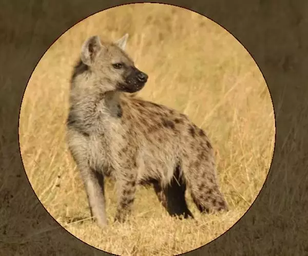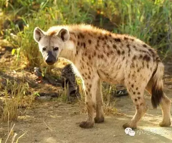 斑鬣狗(学名:Crocuta crocuta):又名斑点鬣狗,体长约95-160厘米,尾长25-36厘米,体重40-86千克,雌性个体明显大于雄性。毛色土黄或棕黄色,带有褐色斑块,鬃毛短或无。上额犬齿不发达,但下颌强大,能将90千克重的猎物拖走100米。