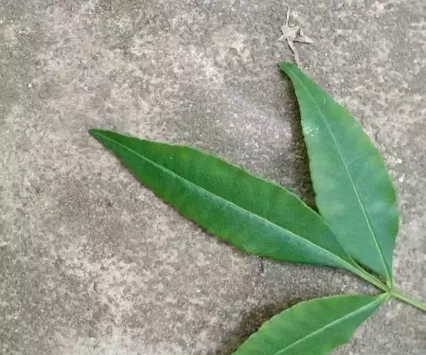 叶有小叶3-9,稀11片,翼叶明显,稀仅有痕迹;小叶对生,通常披针形,长3-12厘米,宽1-3厘米,两端尖,有时基部宽楔形,干后叶缘略向背卷,叶面稍粗皱;或为椭圆形,长4-9厘米,宽2-4.5厘米,顶端中央一片最大,基部一对最小;有时为卵形,叶缘有甚小且疏离的裂齿,或近干全缘,仅在齿缝处或沿小叶边缘有油点;小叶柄甚短或无柄。