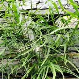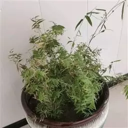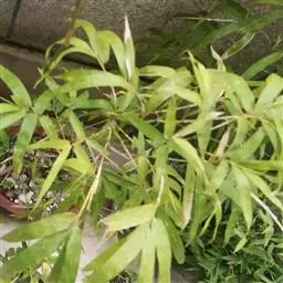 凤尾竹 Raeusch. ex Schult. ’Fernleaf’ R. A. Young)是禾本科,簕竹属孝顺竹的变种。植株较高大,杆高可达6米,竿中空,小枝稍下弯,下部挺直,绿色;竿壁稍薄;节处稍隆起,无毛;叶鞘无毛,纵肋稍隆起,背部具脊;叶耳肾形,边缘具波曲状细长繸毛;叶舌圆拱形,叶片线形,上表面无毛,下表面粉绿而密被短柔毛,小穗含小花,中间小花为两性;外稃两侧稍不对称,长圆状披针形,先端急尖;内稃线形,脊上被短纤毛,花药紫色,子房卵球形,羽毛状。成熟颖果未见。原产中国,华东、华南、西南以至台湾、香港均有栽培。凤尾竹喜温暖、湿润和阳光充足的环境,耐寒。宜土层深厚、肥沃、疏松的微酸性壤土。该种观赏价值较高,宜作庭院丛栽,也可作盆景植物。全草或根入药,味淡、微苦,性寒,有清热利湿、凉血止血、消肿解毒功效,可治痢疾、泄泻等多种病症。凤尾