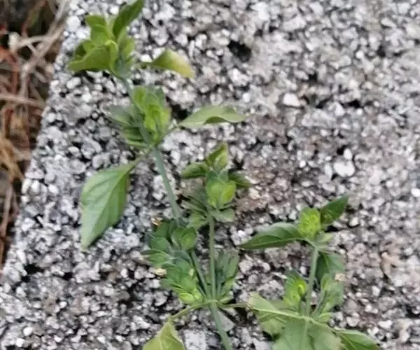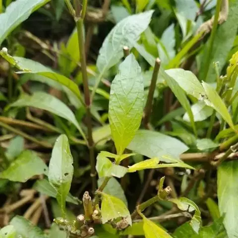 全草长可达80cm。根须状,淡黄色。茎多分枝,折曲状,具棱,节膨大呈膝状,下面节处常匍匐具根。叶对生,暗绿色或灰绿色,多皱缩,完整叶片卵形或卵状披针形,纸质,长2-7cm,宽1-4cm,先端急尖或渐尖,基部楔形,下延,全缘,两面无毛或稍被毛,以上表面叶脉处较多;叶柄长,上面有短柔毛。有的带花,由数个头状花序组成的聚伞花序生于叶腋,叶状苞片一大一小,倒卵状椭圆形;花二唇形。蒴果卵形,开裂者胎座升起。种子有小疣点。气微,味淡微甘。