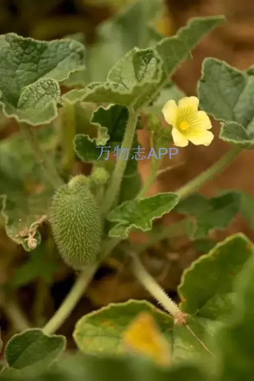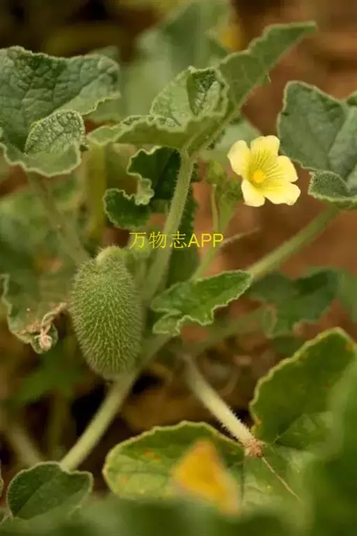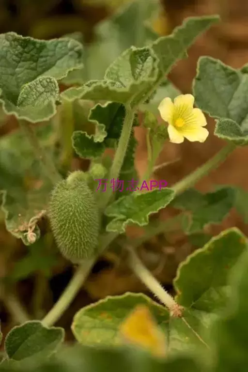 喷瓜 蔓生草本;根伸长,粗壮。茎粗糙,有短刚毛,长约1.5米。叶柄稍粗壮,长5-15厘米,与茎一样,密被短刚毛,具纵纹;单叶互生,叶片卵状长圆形或戟形,缘具齿或波状,长8-20厘米,宽6-15厘米,边缘波状或多少分裂,具粗齿,上面苍绿色,有粗糙的疣点和白色的短刚毛,背面灰白色,密被白色短柔毛,叶脉在叶背隆起,密被白色短刚毛;顶端稍钝,基部弯缺半圆形,宽1-2厘米,深0.5-1厘米,有时近截平。雄花生于总状花序,花序梗稍粗壮,密生黄褐色的长柔毛和短刚毛,花梗短,纤细,长1-3厘米,基部具一小的苞片;花萼裂片披针形,长5-6毫米,宽1.5-2毫米,外面密被柔毛和短刚毛;花冠黄色,展开时径达3厘米,裂片卵状长圆形,顶端有小尖头,3脉;雄蕊花丝长3毫米,基部有长柔毛。果实苍绿色,长圆形或卵状长圆形,长4-5厘米,宽1.5-2.5厘米,粗糙,有黄褐色短刚毛,两端钝,成熟后极膨胀,自果梗脱落后基部开一洞,由瓜瓤收缩将种子和果液同时喷射而出。种子褐色或近黑色,长约4毫米。