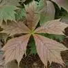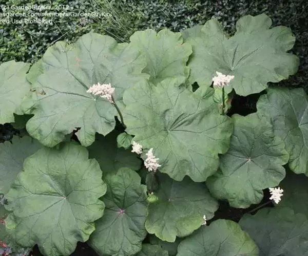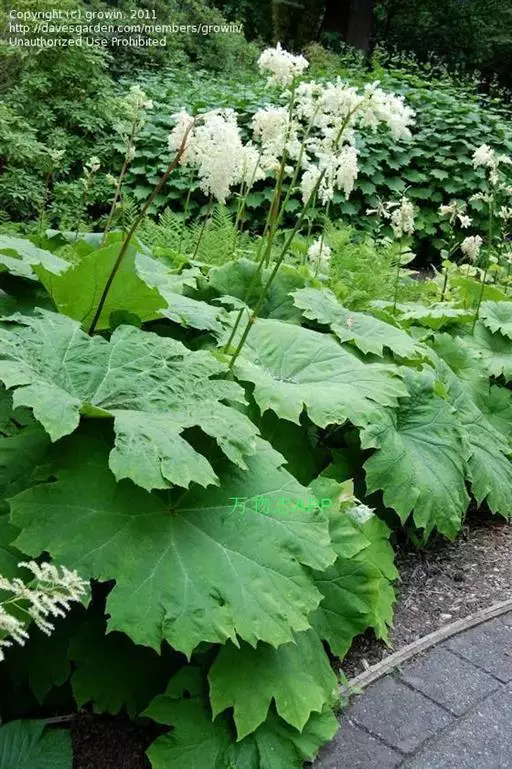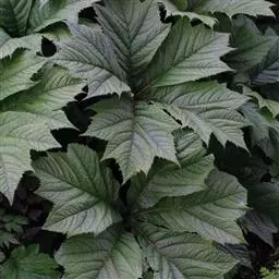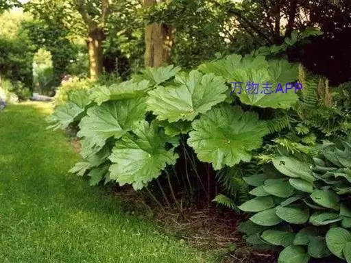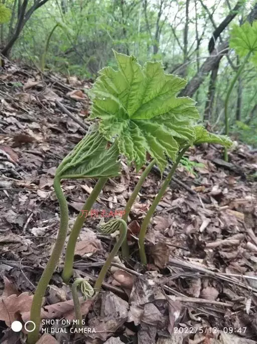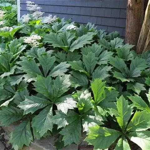 大叶子:又名山荷叶、佛爷伞。多年生草本,高1-1.5m。根茎粗壮,暗褐色,长达35cm,节上生不定根。茎不分枝,下部疏生短硬腺毛。基生叶单一,盾状着生;叶柄长30-60cm,基部扩大成鞘状,抱茎,被刺状硬腺毛;叶片近圆形或卵圆形,直径18-60(-100)cm,掌状浅裂,宽卵形,先端急尖或短渐尖,常再浅裂,边缘具不规则重锯齿,两面被短硬毛;茎生叶较小,掌状3-5浅裂,基部楔形或截形。圆锥花序顶生,长15-20cm;花小,白色或微带紫色;萼片4-5,卵形,先端钝或微凹,背面疏生近无柄之腺毛,5脉与先端汇合;花瓣4-5;雄蕊8;心皮2,下部合生,子房半下位。蒴果。种子狭卵形,具翅。花期6-7月,果期8-9月。