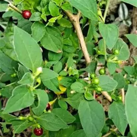 多年生草本,高达1.5m。全株无毛。茎粗壮,分枝,绿色。单叶互生或成对;叶柄长不足1cm;叶片薄纸质,卵形,椭圆形或卵状披针形,长5-18cm,宽3-10cm,先端渐尖,基部歪斜楔型,全缘,或有不明显的粗波状齿。花2-6朵簇生于叶腋或枝腋,俯垂;花梗细弱,长1-2cm,结果时上端肥厚;花萼皿状,5裂,果时稍增大而宿存;花冠淡黄色,钟状,直径6-8mm,裂片卵状三角形,先端尖锐,向外反卷,有短缘毛;雄蕊5;稍伸出花冠,花药黄色,2室,花丝细长;雌蕊1,花柱近等长于雄蕊,柱头头状。浆果球形,直径7-10mm,熟后红色;种子淡黄色。花、果期8-10月。