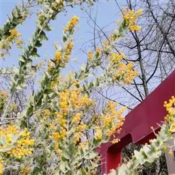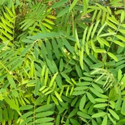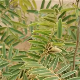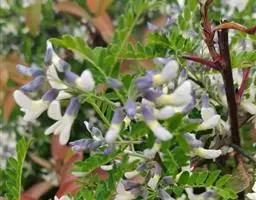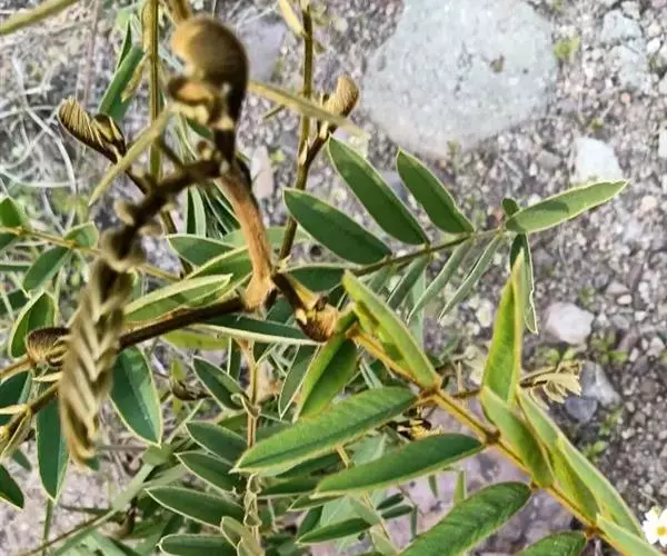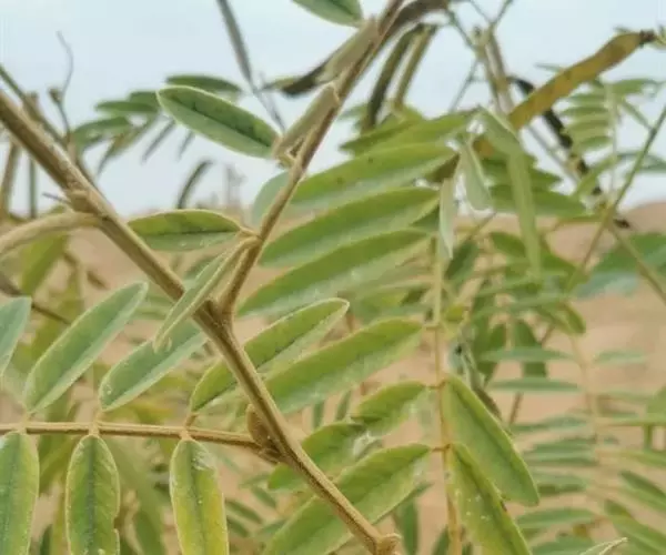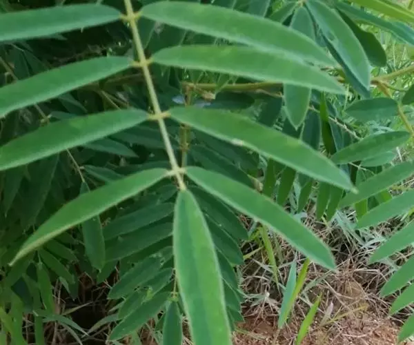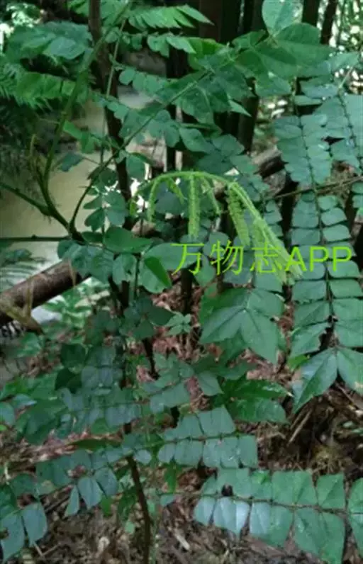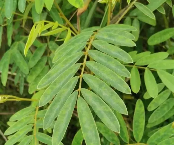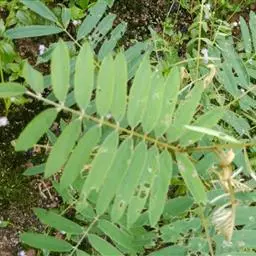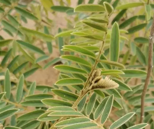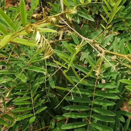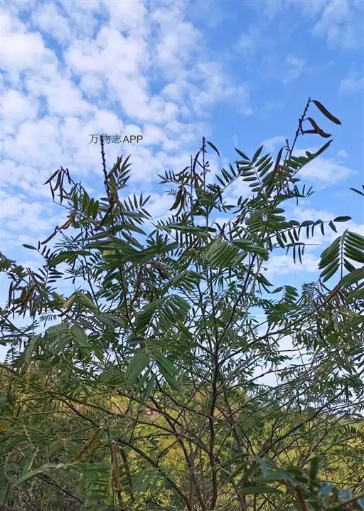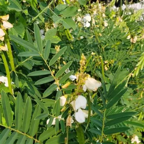 灌木状草本,高1-3.5米。茎木质化,具纵棱,与叶轴同被灰白色茸毛,毛长约0.75-1毫米。羽状复叶长15-25厘米;叶柄长1-3厘米,叶轴上面有沟;托叶三角状钻形,刚毛状直立,长4-7毫米,被毛,宿存;小叶8-12对,长圆形,长3-6厘米,宽6-1.4厘米,先端具细凸尖,上面无毛,下面密被平伏绢毛,侧脉30-50对,纤细,稍隆起;小叶柄长3-4毫米,密被茸毛。