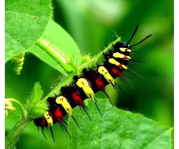 幼虫:粗壮,后胸节最大,体多光滑,有些种类有肉刺或长毛;体色因龄期而变化,初龄多暗色,拟似鸟粪,老龄常为绿、黄色,有红、黑斑而成警戒色;受惊时从前胸前缘中央能翻出红色或黄色Y形或V字臭角,散发出不愉快的气味以御敌。