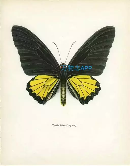 1.雄蝶,翅展约125mm;2.卵,直径约2mm;3.一龄幼虫,体长约12mm;4.三龄幼虫,体长约43mm。