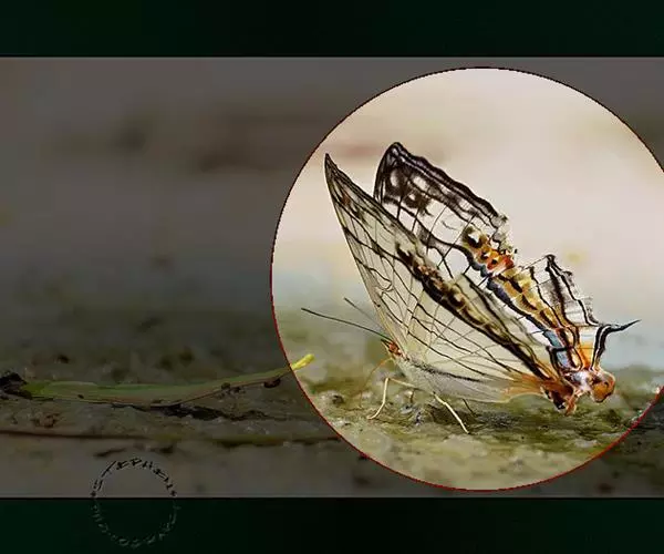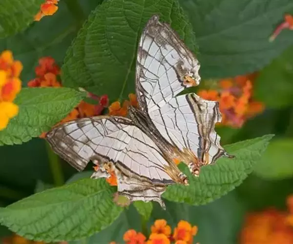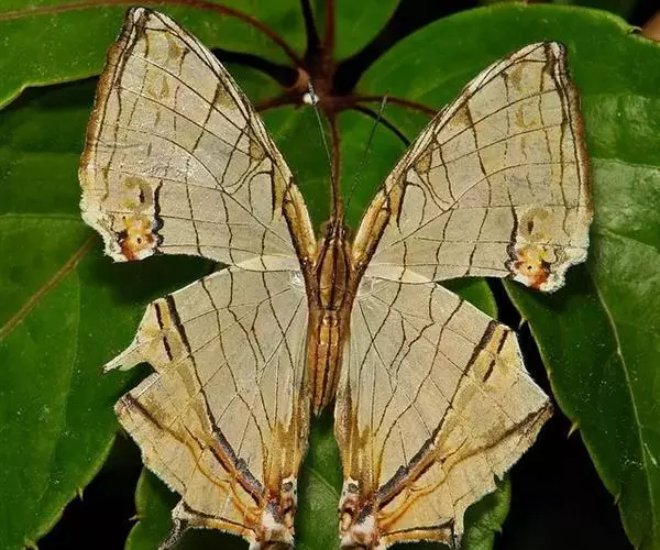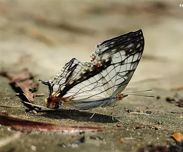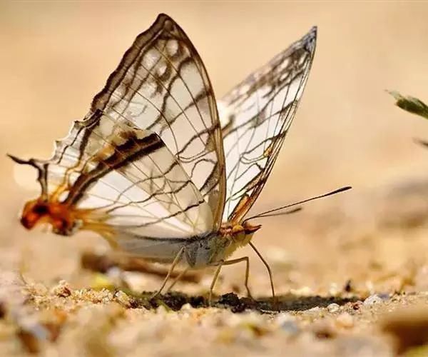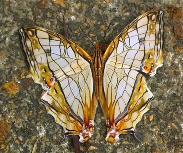如网丝蛱蝶的中、英文俗名,略呈透明白色或残旧黄色的翅膀上布满褐色的条纹,与翅脉相交,如地图的经纬线般,又如纵横交织的丝网般。后翅波浪状,有短尾突。爱在树林里高高的树顶和石面停留,静止时翅膀平展,飞行缓慢。 展翅约 45 至 55 毫米; 三月至十二月可见。翅白色或淡黄色,脉纹褐色清晰,整个翅上的线条和斑纹均为黑褐与赭色或黄色等混合而形成,两翅不少条纹从前翅前缘横穿后翅,直达臂缘,与翅脉相交形成网纹。前翅顶角尖锐,后角有一个赭色杂以绿黄色似花束的斑,后翅臂角有2个似前翅后角的花纹。幼虫食用榕属植物。