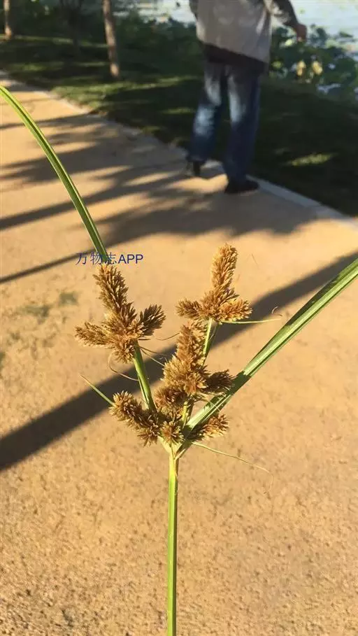 一年生草本,具须根。秆散生,粗壮,高50-95厘米,钝三稜形,平滑,基部稍膨大,具少数叶。叶短于秆,宽4-8毫米,边缘不粗糙;叶鞘长,红棕色。叶状苞片3-4枚,较花序长,边缘粗糙;复出长侧枝聚繖花序具3-8个辐射枝,辐射枝长短不等,最长达12厘米;穗状花序无总花梗,近于圆形、椭圆形或长圆形,长1-3厘米,宽6-17毫米,具极多数小穗;小穗多列,排列极密,线状披针形或线形,稍扁平,长5-10毫米,宽1.5-2毫米,具8-16朵花;小穗轴具白色透明的翅;鳞片排列疏松,膜质,近长圆形,顶端钝,长约2毫米,棕红色,背面无龙骨状突起,脉极不明显,边缘内卷;雄蕊3,花药短,长圆形,暗血红色,药隔突出于花药顶端;花柱长,柱头3,较短。小坚果长圆形,三稜形,长为鳞片的1/2,灰色,具明显的网纹。花果期6-l0月。