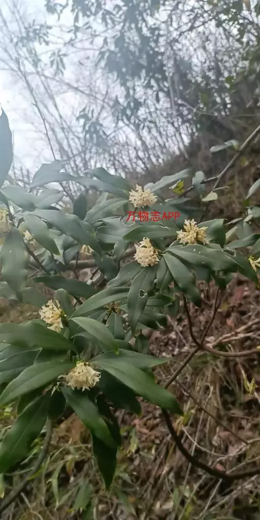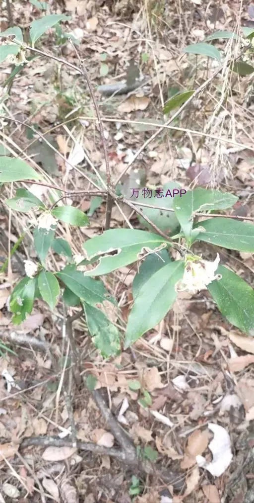 常绿直立灌木,高0.5-1.2米,二歧状或伞房分枝;枝深紫色或紫红色,通常无毛,有时幼嫩时具粗绒毛;腋芽近圆形或椭圆形,鳞片卵形,顶端圆形,稀钝形,除边缘具淡白色流苏状缘毛外无毛,通常褐色。叶互生,有时簇生于枝顶,叶片革质,椭圆形或披针形,长6-12厘米,宽1.8-3厘米,两端渐尖,基部下延于叶柄,边缘全缘,微反卷,上面深绿色,具光泽,干燥后有时起皱纹,下面淡绿色,中脉纤细,上面通常凹陷,下面微隆起,侧脉6-7对,纤细,上面微凸起,稀微凹下,下面不甚明显;叶柄两侧翅状,长6-8毫米,褐色。花白色,有时淡黄白色,9-12朵簇生于枝顶,呈头状花序,花序下具苞片;苞片褐绿色易早落,长圆状披针形,外面大的苞片长达 15毫米,宽4毫米,内面小的苞片长8毫米,两面无毛,顶端尾尖或渐尖,边缘具短的白色流苏状缘毛;几无花序梗,花梗长1-2毫米,密被淡黄绿色粗绒毛;花萼筒圆筒状,外面下部密被淡黄绿色丝状绒毛,上部较稀疏,长10-14毫米,裂片4,卵状三角形或卵状长圆形,长约5毫米,顶端钝尖,无毛;雄蕊8,2轮,分别着生于花萼筒上部及中部,花丝长约2毫米,花药长的长圆形,长约2.1毫米;花盘短杯状,长0.7毫米,边缘全缘或微波状,外面无毛;子房无毛,倒圆锥状圆柱形,长2.2毫米,顶端渐尖,窄成短的花柱,柱头头状,直径0.7毫米。果实红色,广椭圆形或卵状椭圆形,长10毫米,直径5-6毫米。花期11至次年2月,果期4-5月。 [2-3]