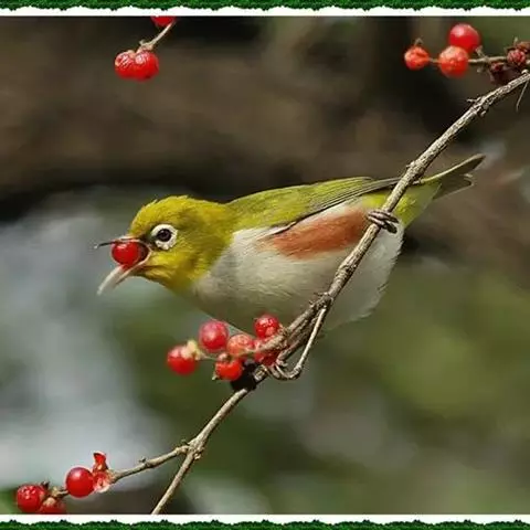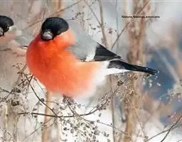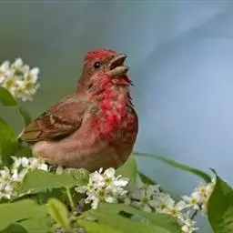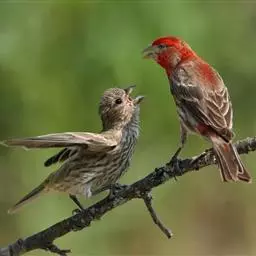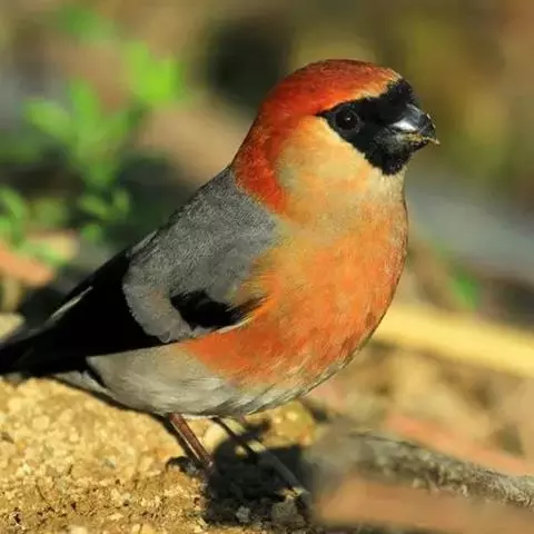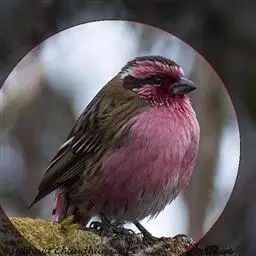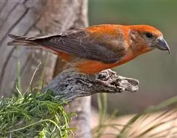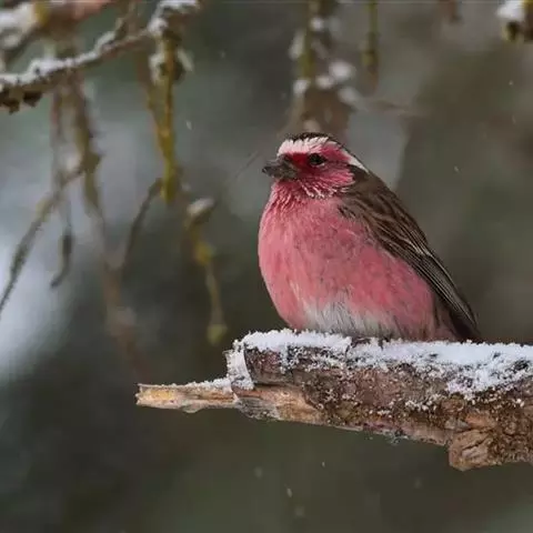 红腰朱雀:体长12-14厘米,小型鸟类。雄鸟前额和眉纹玫瑰粉红色,头顶和一宽的贯眼带深红褐色,背红…