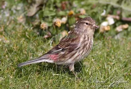 雌鸟和雄鸟相似,但腰下无红色、呈淡皮黄色具淡褐色纵纹和白色羽缘。