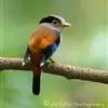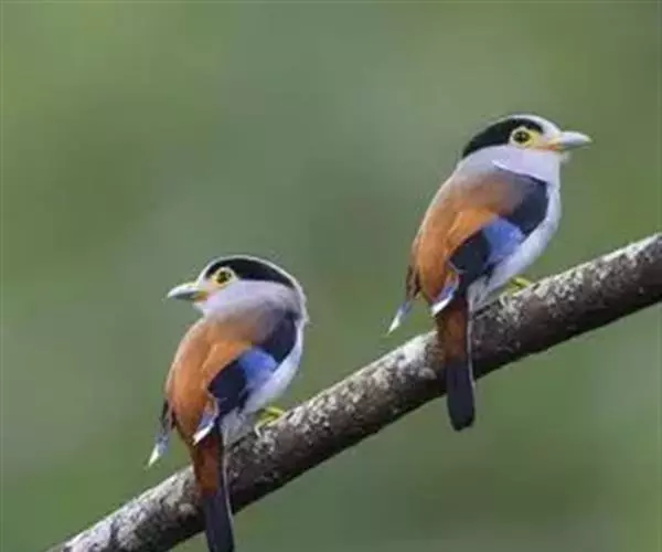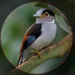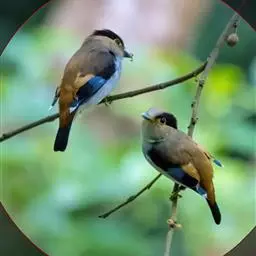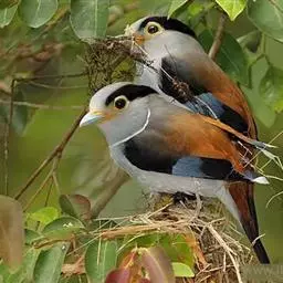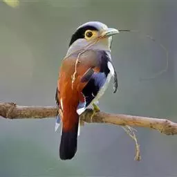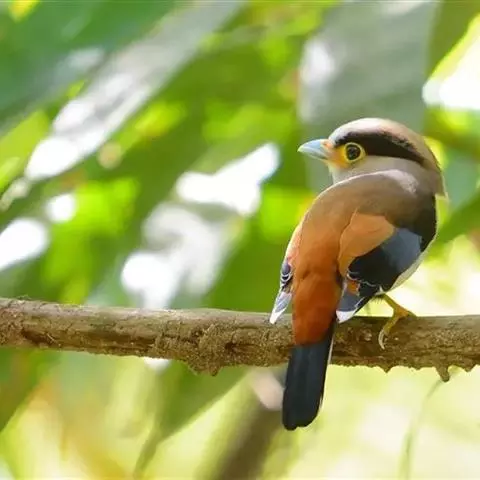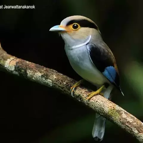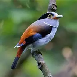 银胸丝冠鸟(学名:Serilophus lunatus)是雀形目阔嘴鸟科的鸟类,在全世界共分化为10个亚种。体长16-18厘米。嘴宽阔、天蓝色,基部橙色。鼻孔圆形具宽阔的黑色眉纹。上背烟灰色,下背至尾上覆羽栗色,两翅的翼缘白色,翼角羽缘缀浅灰蓝色,覆羽和羽端均为亮黑色,翅膀表面具有显著的亮蓝色和白色翼镜。尾羽黑色,中央两对纯黑,第三对多少沾一些白色,其余尾羽均具宽阔的白色端斑,呈凸尾型。跗蹠和趾蓝绿色。属热带森林鸟类,栖息于海拔90-1400米热带、亚热带地区的各种类型的树林中,主要以昆虫为食,也吃植物果实。