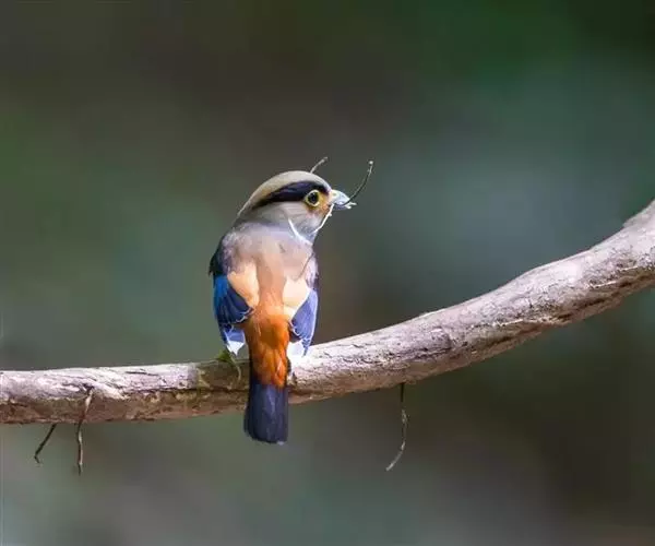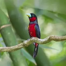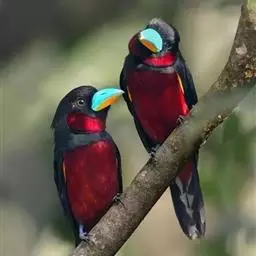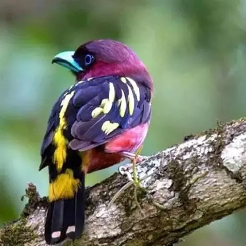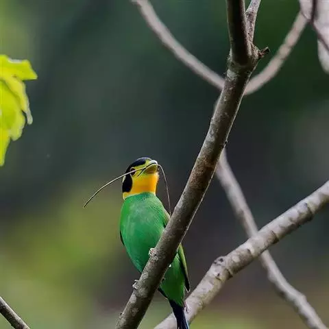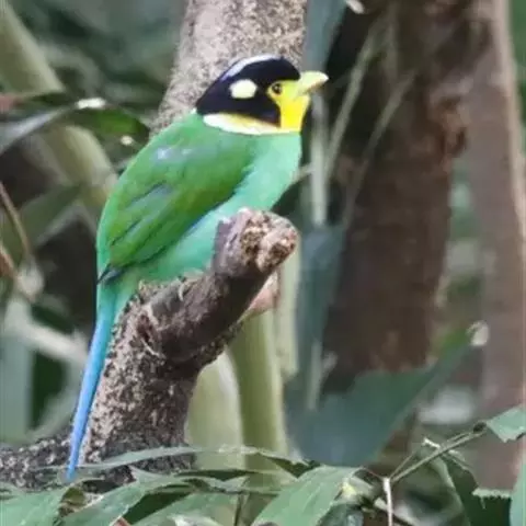 长尾阔嘴鸟是雀形目阔嘴鸟科的鸟类,体长约25厘米,是绿色阔嘴鸟。形长的楔形尾蓝色,喉及脸黄色,顶冠…