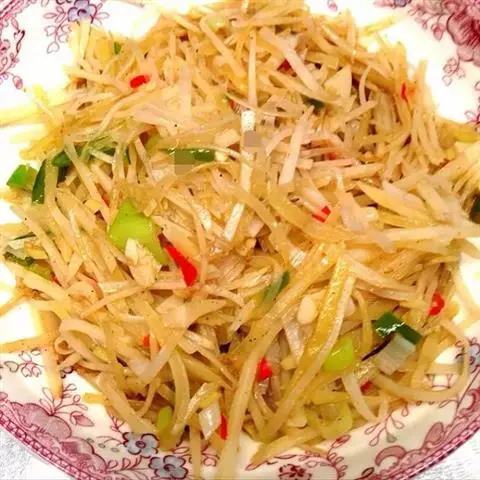 醋熘三丝是以土豆、青椒等为主要食材制作的美食。