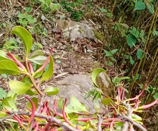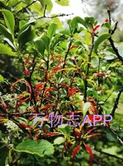 柳叶钝果寄生 灌木,高0.5-1米,全株无毛;二年生枝条黑色,具光泽。叶互生,有时近对生或数枚簇生于短枝上,革质,卵形、长卵形、长椭圆形或披针形,长3-5厘米,宽1.5-2厘米,顶端圆钝,基部楔形,稍下延;侧脉3-4对,叶柄长2-4毫米。伞形花序,1-2个腋生或生于小枝已落叶腋部,具花2-4朵,总花梗长1-2毫米或几无,花梗长4-6毫米;苞片卵圆形,长约2毫米;花红色,花托椭圆状,长约2.5毫米.浅齿,稀具撕裂状芒;花冠花蕾时管状,长2-3厘米,稍弯,顶部椭圆状,裂片4枚,披针形,长6-9毫米,反折;花丝长约2毫米,花药长3-4毫米;花柱线状,柱头头状。果椭圆状,长8-10毫米,直径4毫米,黄色或橙色。花期2-7月,果期5-9月。