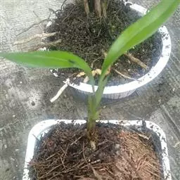 将豆粒大的混合石砾倒入盆底至三分之一处。然后倒入中粒植料至五分之四处,填实和尽量不要留下空间。种植时,左手握持兰草,右手加泥(要防止泥土贯入叶心),再将兰株稍稍提起,使根自然舒展。然后边加土边摇盆,使土与根紧密接触。再用手将茎部四周的泥土按紧,最后使盆面略显馒头状(即中间四周略低)。将竹筷拔出,并摇实盆中植料。填实植料后,再用大粒植料埴入至距盆缘1.5厘米处。最后再倒入豆粒大植料,以将假鳞茎全部埋入土中为度,然后充分摇实。用压土工具轻压植料,并将表面弄平。