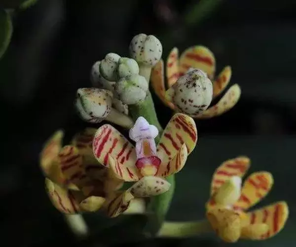 五唇兰:又称五舌兰,叶丛生,肉质状。基部关节明显,无明显茎。花葶抽生于基部,疏生十余朵小花,花为紫…