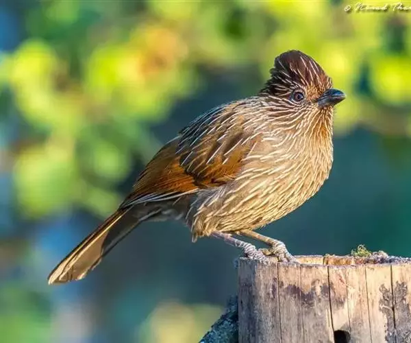 条纹噪鹛(学名:Grammatoptila striata)是画眉科、噪鹛属中型鸟类,体长28-32厘米。头具短的羽冠,上体栗褐色,飞羽外翻蓝灰色。下体棕栗色,腹以后转为褐白色。除飞羽和尾羽外,所有上、下体羽均具白色羽干纹。极为醒目。野外特征明显,容易识别。虹膜橙红色,嘴黑褐色,脚暗褐色。