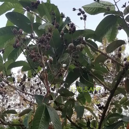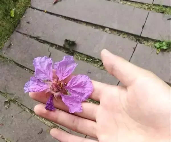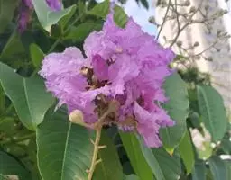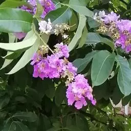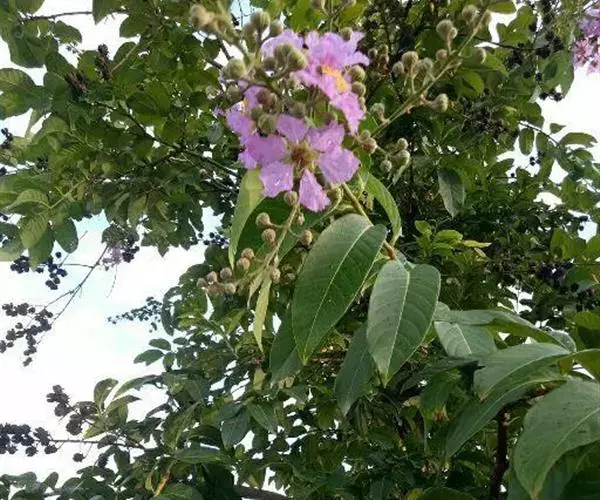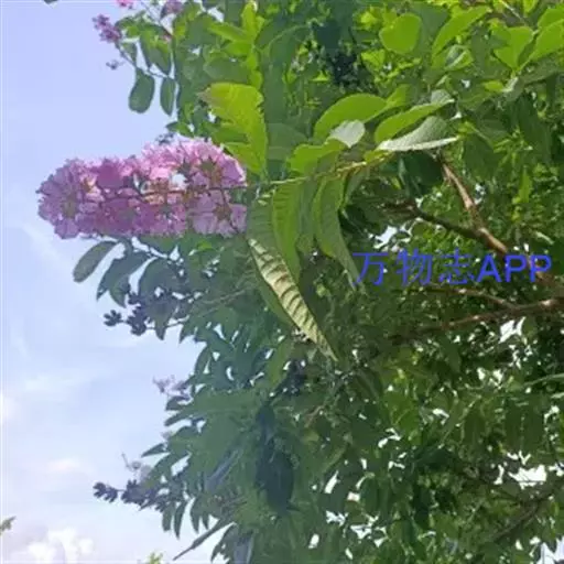 大花紫薇 大乔木,高可达25米;树皮灰色,平滑;小柱圆柱形,无毛或微被糠批状毛。叶革质,矩圆状椭圆形或卵状椭圆形,稀披针形,甚大,长10-25厘米,宽6-12厘米,顶端钝形或短尖,基部阔楔形至圆形,两面均无毛,侧脉9-17对,在叶缘弯拱连接;叶柄长6-15毫米,粗壮。花淡红色或紫色,直径5厘米,顶生圆锥花序长15-25厘米,有时可达46厘米;花梗长1-1.5厘米,花轴、花梗及花萼外面均被黄褐色糠粃状的密毡毛;花萼有棱12条,被糠粃状毛,长约13毫米,6裂,裂片三角形,反曲,内面无毛,附属体鳞片状;花瓣6,近圆形至矩圆状倒卵形,长2.5-3.5厘米,几不皱缩,有短爪,长约5毫米;雄蕊多数,达100-200;子房球形,4-6室,无毛,花柱长2-3厘米。蒴果球形至倒卵状矩圆形,长2-3.8厘米,直径约2厘米,褐灰色,6裂;种子多数,长10-15毫米。花期5-7月,果期10-11月。