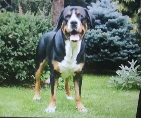 大瑞士山地犬的英文名为:Greater Swiss Mountain Dog,原产地:瑞士。属于工作犬。是一种显眼的、三色、巨大、有力的,而且外观坚定的狗。在四种瑞士山地犬中体型最大,有光滑平顺的毛与始终拖在背后的长尾巴。