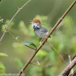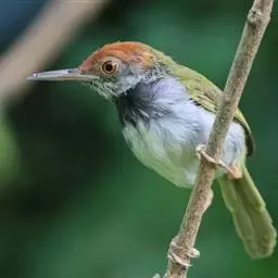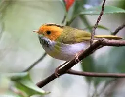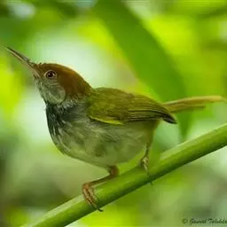 黑喉缝叶莺:体长11.5厘米,是一种小型的顶冠棕色、腹部白色的莺。尾甚长而常上翘,臀黄色,…