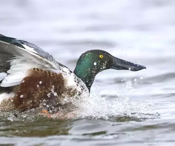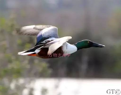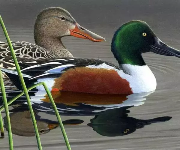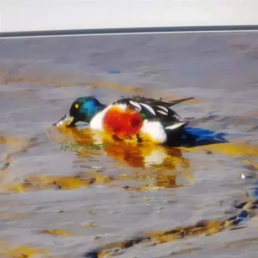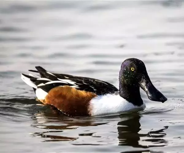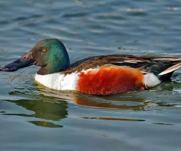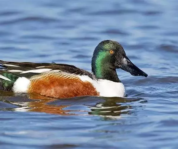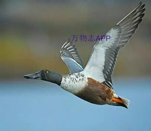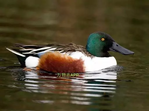 琵嘴鸭(学名:Anas clypeata):属中型鸭类,个体比绿头鸭稍小,体长43-51厘米,体重0.5千克左右。雄鸭头至上颈暗绿色而具光泽,背黑色,背的两边以及外侧肩羽和胸白色,且连成一体,翼镜金属绿色,腹和两胁栗色,脚橙红色,嘴黑色,大而扁平,先端扩大成铲状,形态极为特别。雌鸭略较雄鸭为小,外貌特征亦不及雄鸭明显,也有大而呈铲状的嘴。