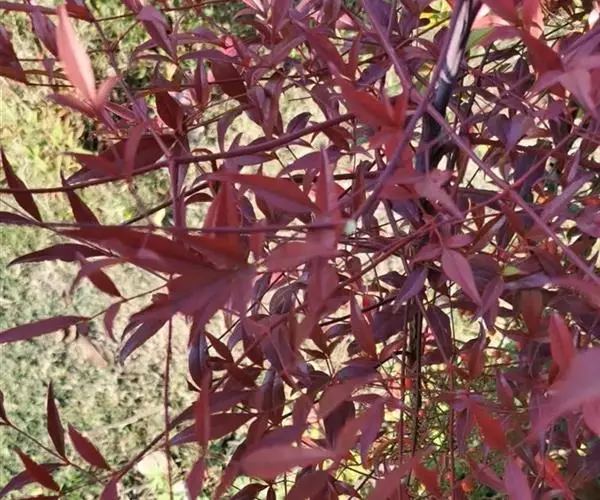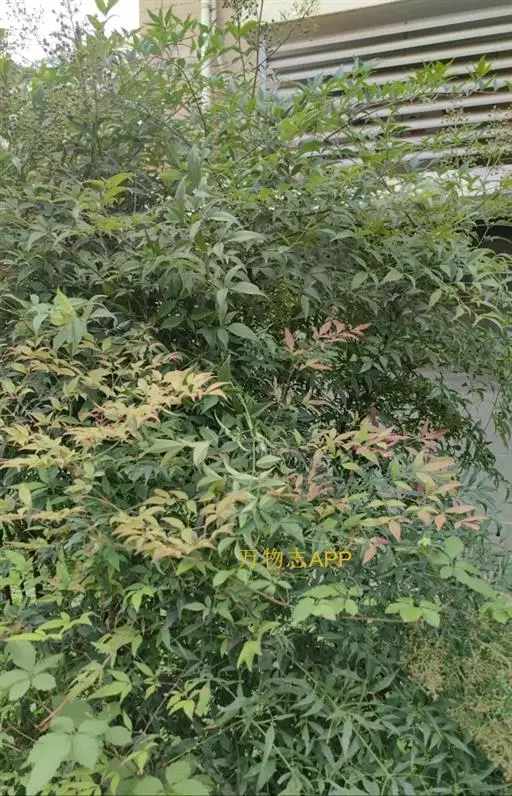 常绿小灌木。茎常丛生而少分枝,高1-3米,光滑无毛,幼枝常为红色,老后呈灰色。叶互生,集生于茎的上部,三回羽状复叶,长30-50厘米;二至三回羽片对生;小叶薄革质,椭圆形或椭圆状披针形,长2-10厘米,宽0.5-2厘米,顶端渐尖,基部楔形,全缘,上面深绿色,冬季变红色,背面叶脉隆起,两面无毛;近无柄。