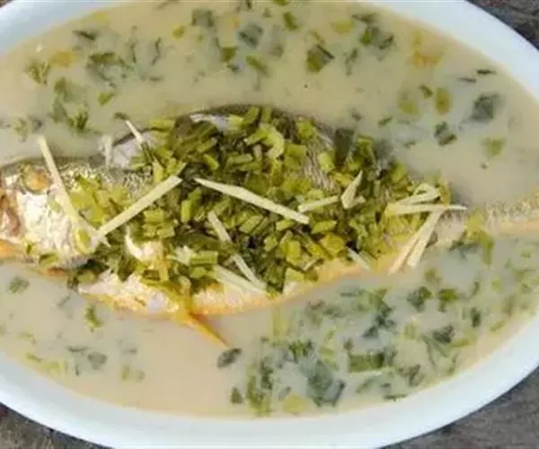 6. 焖至汤如白奶,鱼眼凸出、剞纹绽裂时,加入芥菜梗段、笋片、葱结、精盐,用旺火烧开,再加味精,盛入大汤碗中即成。