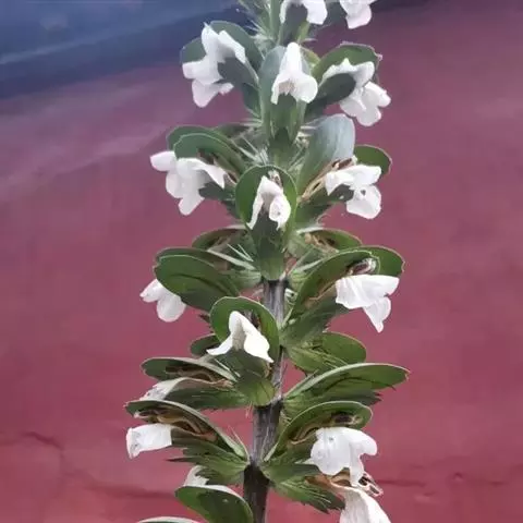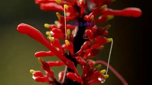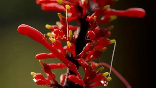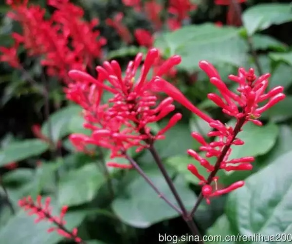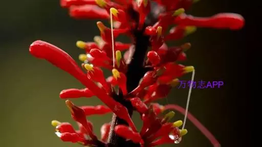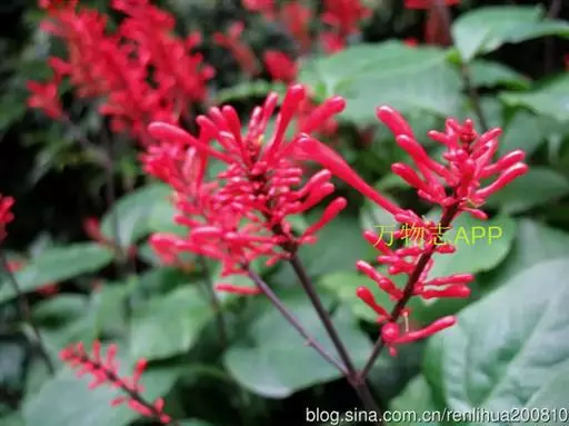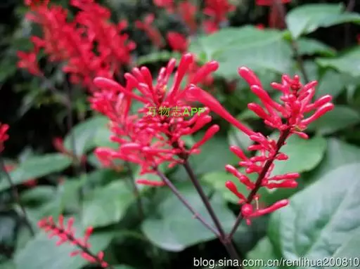 穗状花序,花红色,花梗细长;花萼钟状,5裂;花冠长管形,二唇形,上唇2裂,下唇3裂;可孕雄蕊2,不 孕雄蕊2;雌蕊心皮2,合生;花柱1,柱头2裂,子房2室,上位;蒴果,背裂2瓣。