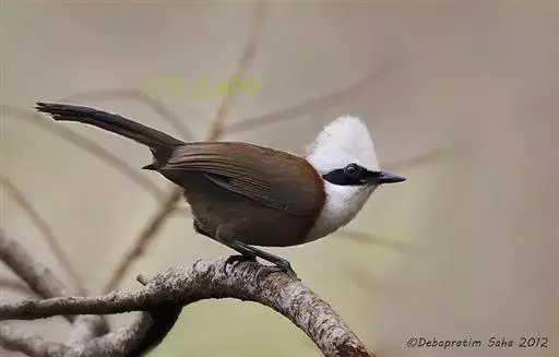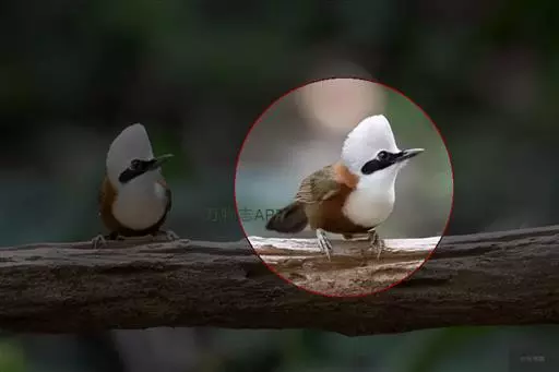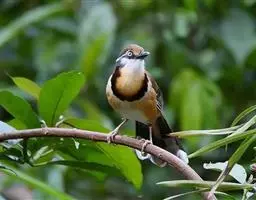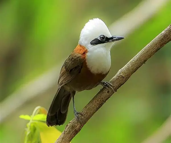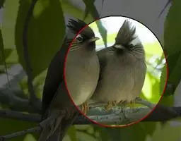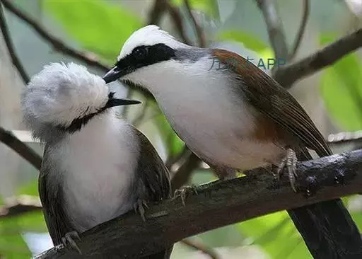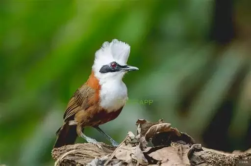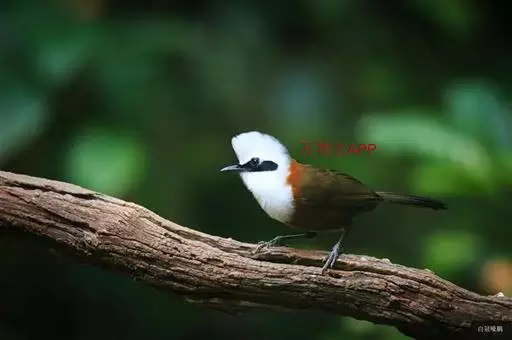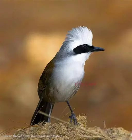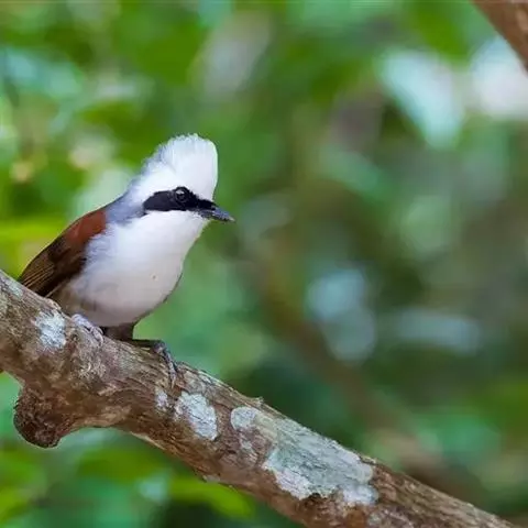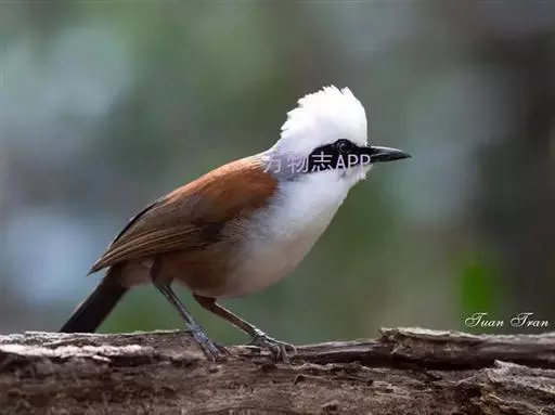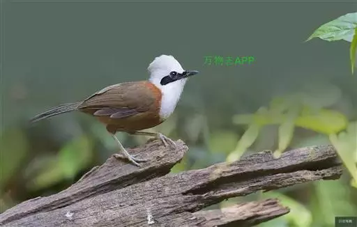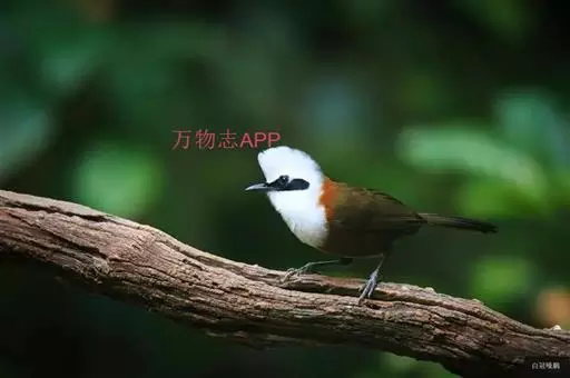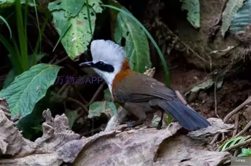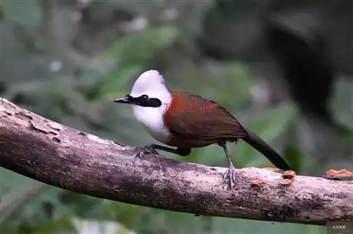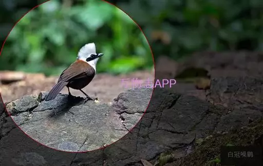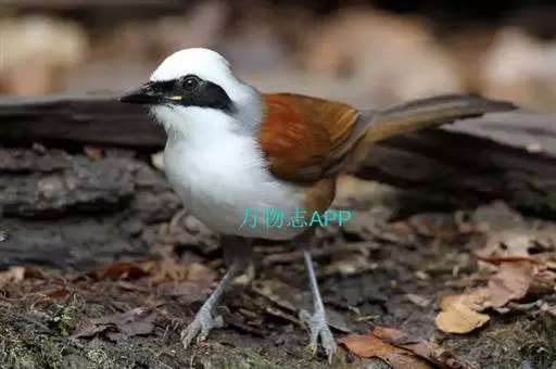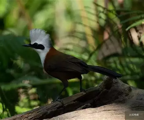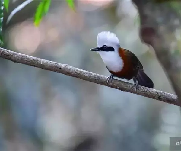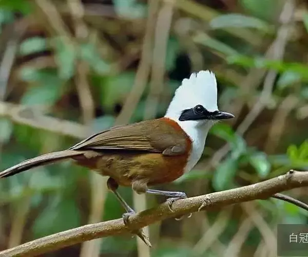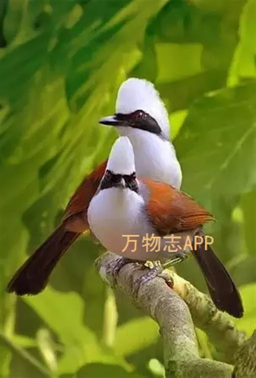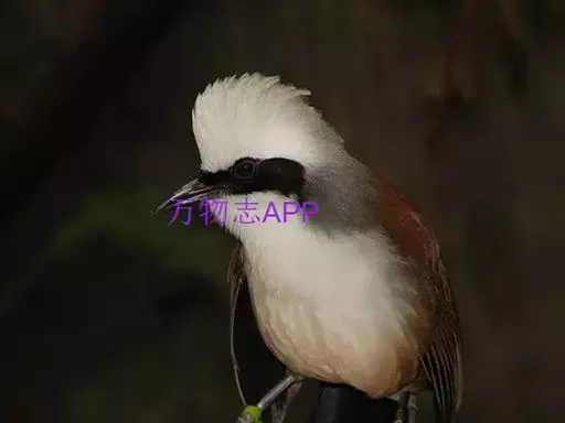 白冠噪鹛 白冠噪鹛雌雄羽色相似。整个头、头侧、羽冠以及颏、喉和上胸白色;前额基部、眼先、眼周和耳羽黑色,形成一条宽阔的黑色贯眼纹,在白色头部极为醒目;最长的冠羽后部逐渐变为灰色或棕灰色,紧靠头部白色之后有一锈红色或棕栗色领圈,沿颈侧延伸至同色的下胸,领圈后的上下体羽概为橄榄褐色。滇南亚种无领圈,白色头部后的后颈呈灰色或蓝灰色,背栗褐色往后渐淡,下体几全为白色,仅两胁和尾覆羽棕色;两翅和尾暗褐色微缀橄榄褐色。虹膜红褐色或棕红色,嘴黑色,脚黑灰色至淡褐色。