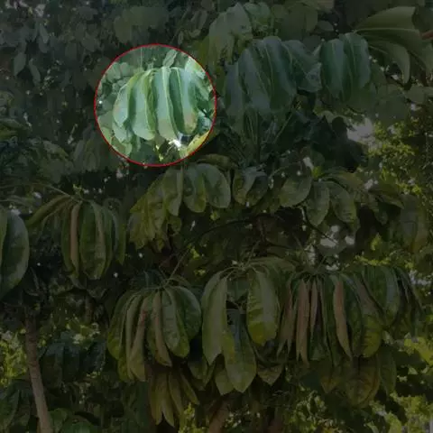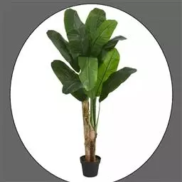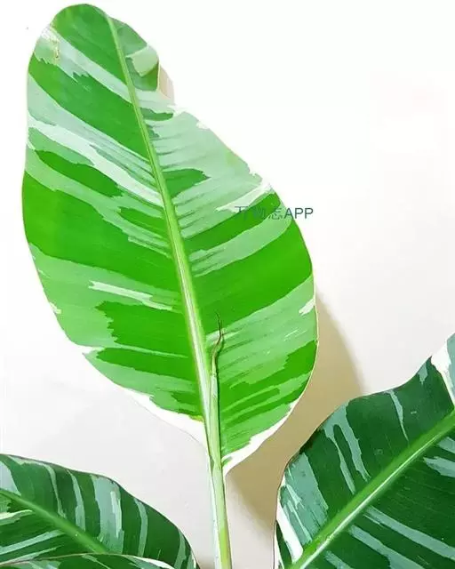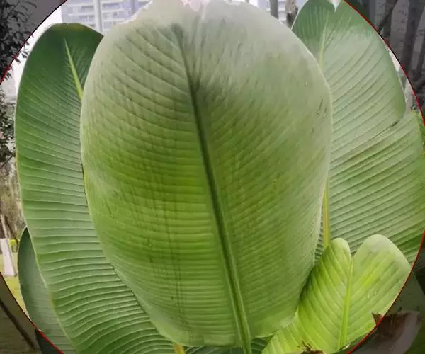 植株高2.5-4米。叶片长圆形,长2-3米,宽25-30厘米,先端钝,基部圆形或不对称,叶面鲜绿色,有光泽;叶柄粗壮,长达30 厘米。