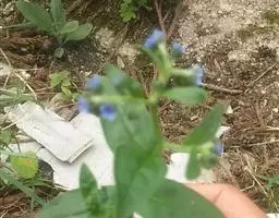 勿忘草 多年生草本。茎直立,单一或数条簇生,高20-45厘米,通常具分枝,疏生开展的糙毛,有时被卷毛。基生叶和茎下部叶有柄,狭倒披针形、长圆状披针形或线状披针形,长达8厘米,宽5-12毫米,先端圆或稍尖,基部渐狭,下延成翅,两面被糙伏毛,毛基部具小形的基盘;茎中部以上叶无柄,较短而狭。