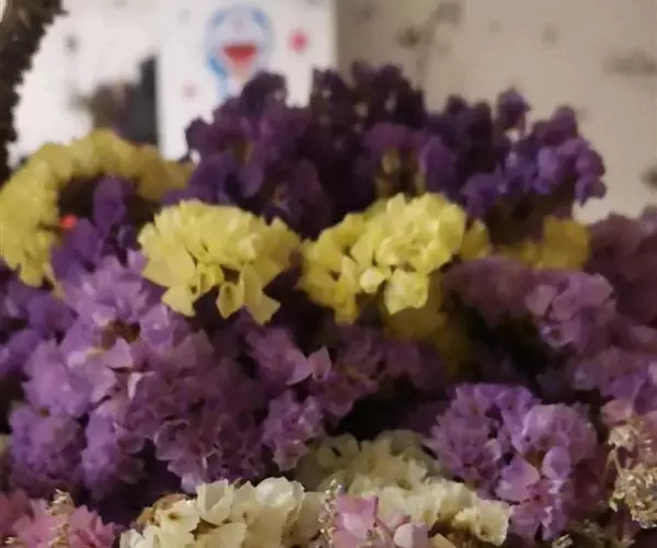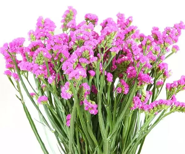 补血草(学名:Limonium sinense(Girard.) Kuntze),原产地中海地区,多年生草本,常作二年生栽培,全株具糙毛。叶丛生于茎基部,叶片大头羽裂。花序自基部分枝,呈伞房状聚伞圆锥花序,疏松,开张,花枝长,可达1米,花序枝具3~5翼,小花穗上有3~5朵花,着生于短而小的花一侧;花萼管状,干膜质,有紫、淡紫、玫瑰粉、蓝、红、白、黄各色。