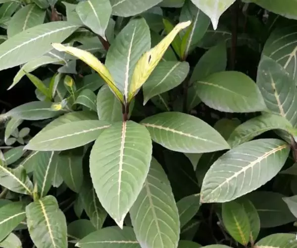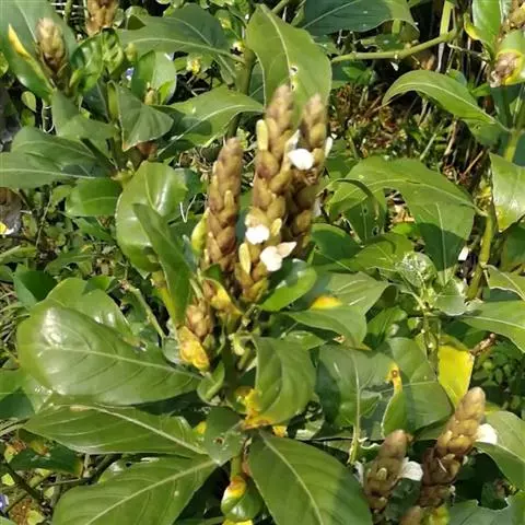 灌木,高达2米。叶具1-2.5厘米的柄,叶片矩圆形,倒卵形,顶端渐尖,或尾尖,基部楔形至宽楔形,下沿,边缘为波状圆齿,长9-15厘米,宽3.7-5.2厘米,侧脉7-12条。干时(?)常黄色。顶生穗状花序小,苞片大,长1.5厘米,宽8毫米,花萼2.2厘米,花冠5厘米,冠管4.5厘米,冠檐5-6毫米;雄蕊4,花丝细长,伸出冠外,疏被长柔毛,花药2室,密被白色毛,背着,基部稍叉开;花柱细长,柱头伸出管外,高于花药。