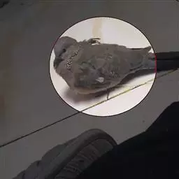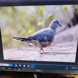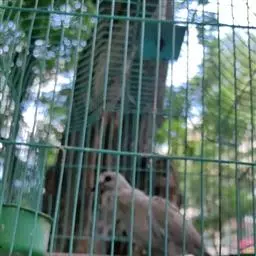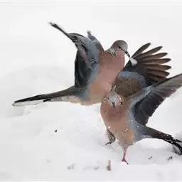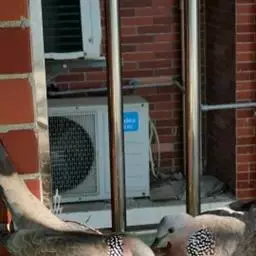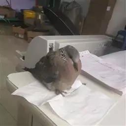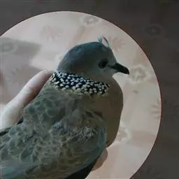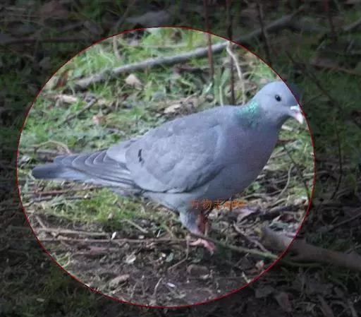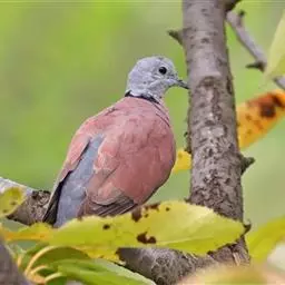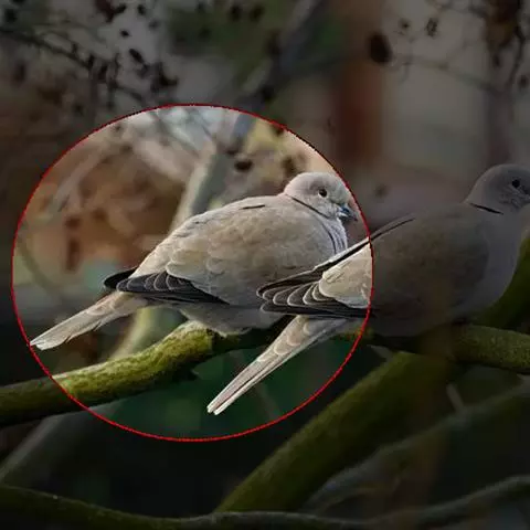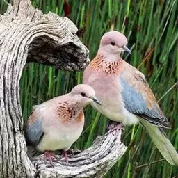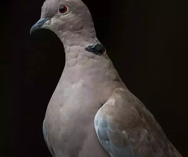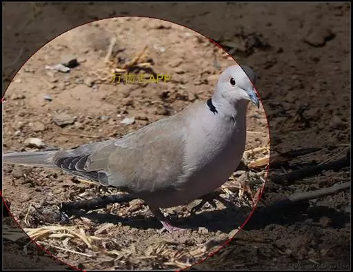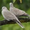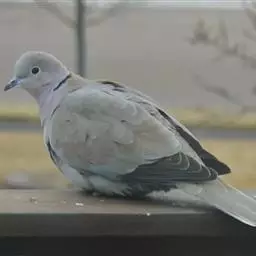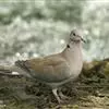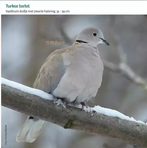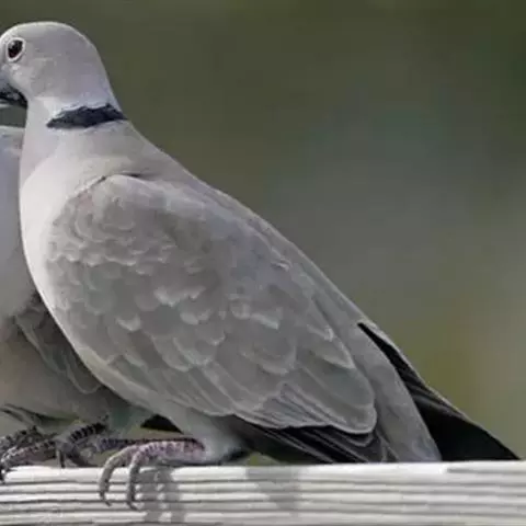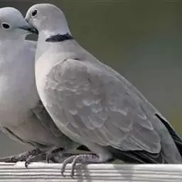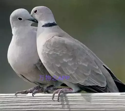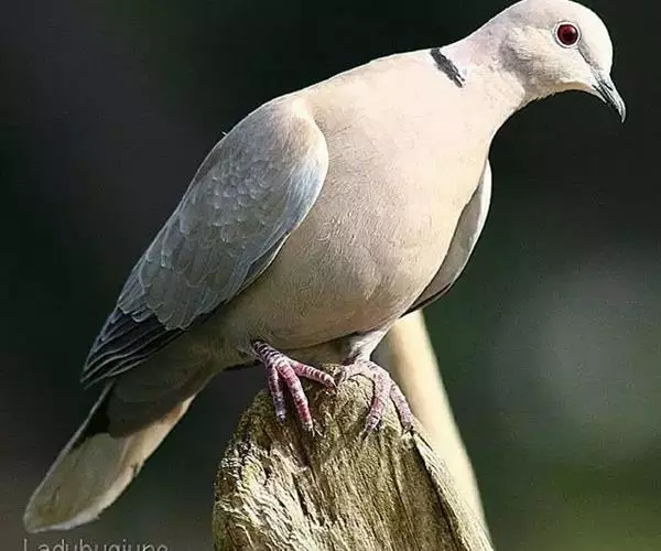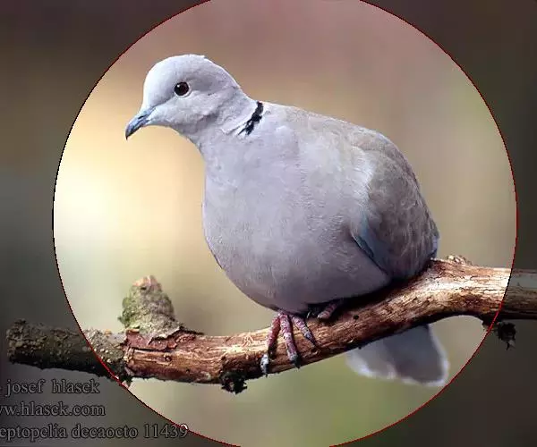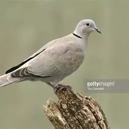 灰斑鸠(学名:Streptopelia decaocto):其全身灰褐色,翅膀上有蓝灰色斑块,尾羽尖端为白色,颈后有黑色颈环,环外有白色羽毛围绕。虹膜红色,眼睑也为红色,眼周裸露皮肤自包或浅灰色,嘴近黑色,脚和趾暗粉红色。