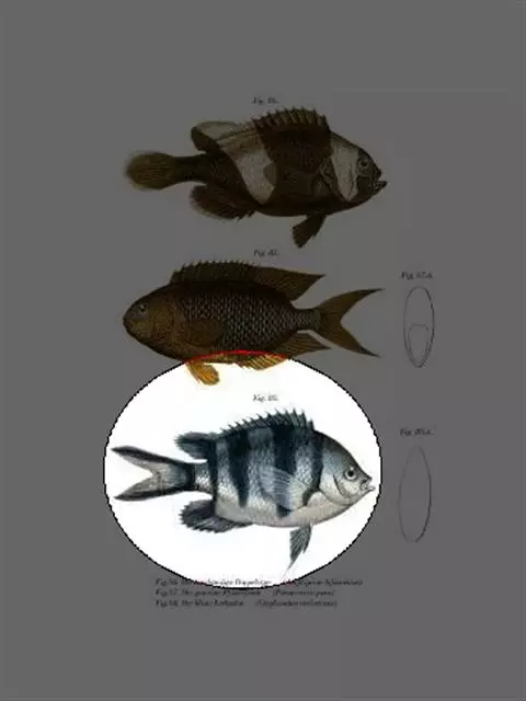眼斑双锯鱼,背鳍硬棘被橘黄色斑块分割为5-6枚,第4枚最长,约为头长的2.1-2.9倍。胸鳍、臀鳍…