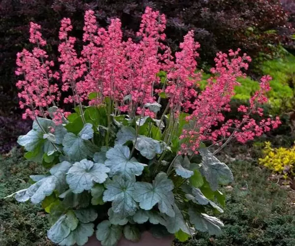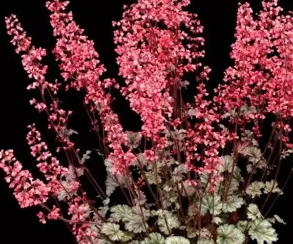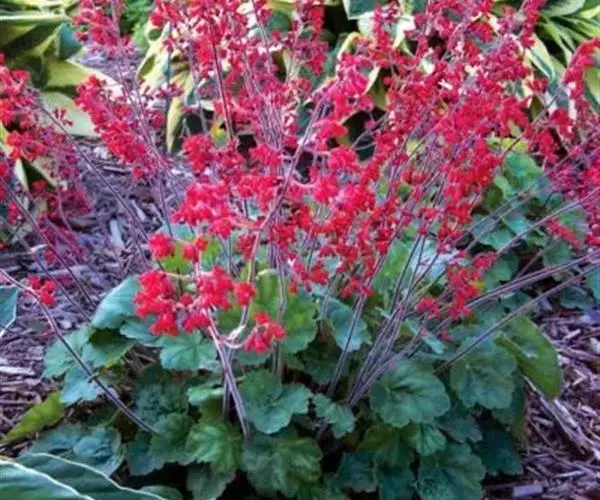 多年生耐寒草本,高度10-50cm,浅根性。叶近圆形,缘具圆齿,阔心形,长20-25cm,深绿色,在温暖地区冬季常绿。花小钟状,径约0.6-1.2cm,红色,两侧对称,小花着生在总花便上形成圆锥花序,高出叶丛,雄蕊5枚,萼片长于花瓣,小花粉红色,分裂,花期5-6月。本种与其它一些原产北美种杂交选育出许多园艺品种,有白、粉、粉红、红色、大花等品种。
