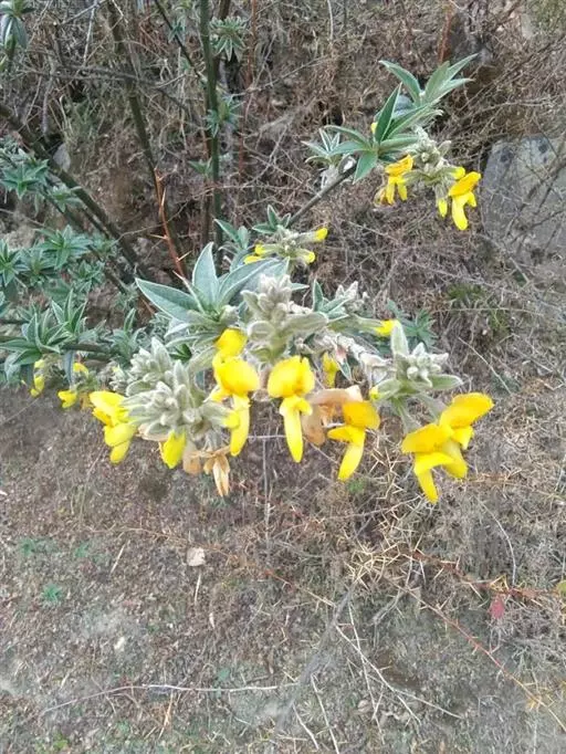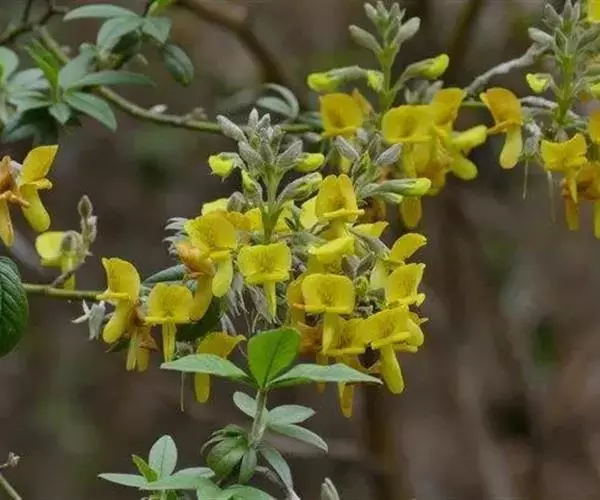 尼泊尔黄花木 总状花序顶生,长5-8厘米,具花2-4轮,花后几不伸长,密被白色棉毛,不脱落;苞片阔卵形,长约1.2厘米,先端锐尖,密被毛;花梗长2-2.5厘米;花长约3厘米;萼钟形,长1.2-1.6厘米,被白色棉毛,萼齿5,上方2齿合生,三角形,长4毫米,下方3齿披针形,与萼筒近等长;