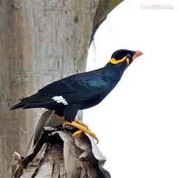 金冠树八哥为椋鸟科树八哥属的鸟类。体长约23厘米,闪辉黑色。特征为具翼斑及颏黄色,脸颊裸露皮肤粉黄色。…