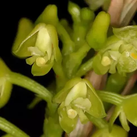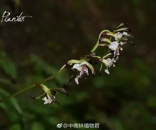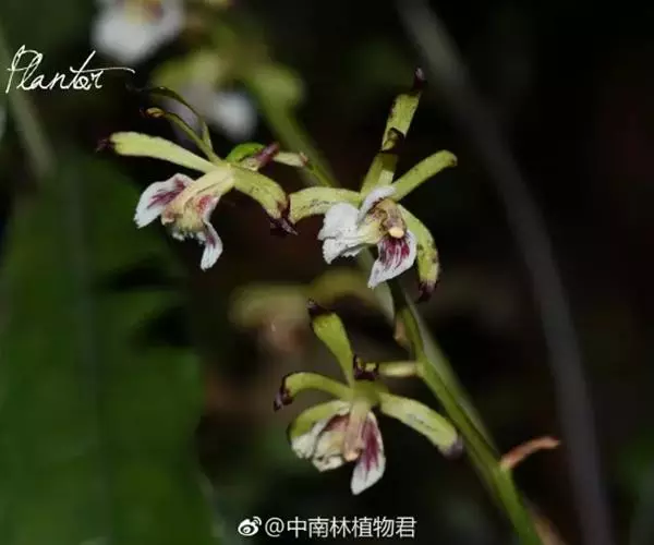 花葶长达38厘米;总状花序疏生4-9朵花;花序柄被3枚鞘;花苞片狭披针形,约等长于花梗和子房,通常长1-1.5厘米,先端渐尖;萼片和花瓣绿色,先端内面具红色斑点;中萼片狭长圆状披针形,长15-17毫米,宽2.2-2.5毫米,先端渐尖,具3条脉;侧萼片镰刀状倒披针形,比中萼片稍短而宽,先端渐尖,基部贴生于蕊柱足,具3条脉。