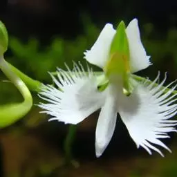 花瓣相似于侧萼片,近先端处宽2毫米,先端渐尖,具3条脉;唇瓣白色带红色斑点和条纹,近圆形,长10-14毫米,基部具长约5毫米的爪,3裂;侧裂片斜卵形,先端锐尖,上缘具不整齐的齿,摊平后两侧裂片先端之间相距约8毫米;中裂片倒卵形,宽约5毫米,先端近圆形并稍凹人,边缘具不整齐的齿;唇盘在两侧裂片之间具2条褶片;褶片下延到唇瓣的爪上;距圆筒状,长约4毫米,末端钝;蕊柱长约1厘米,基部扩大,具长约4毫米的蕊柱足;蕊柱翅在蕊柱上端扩大而呈圆耳状。花期5-9月。
