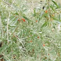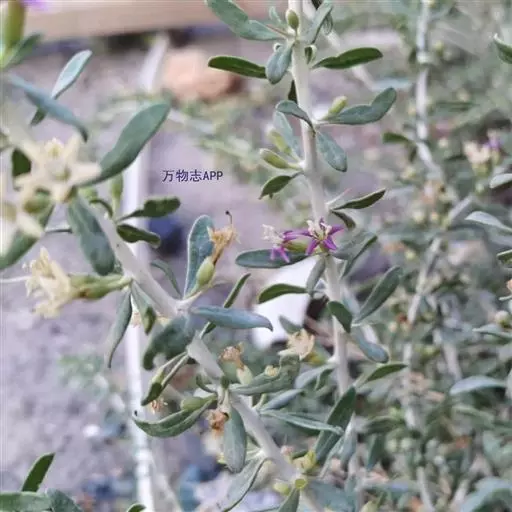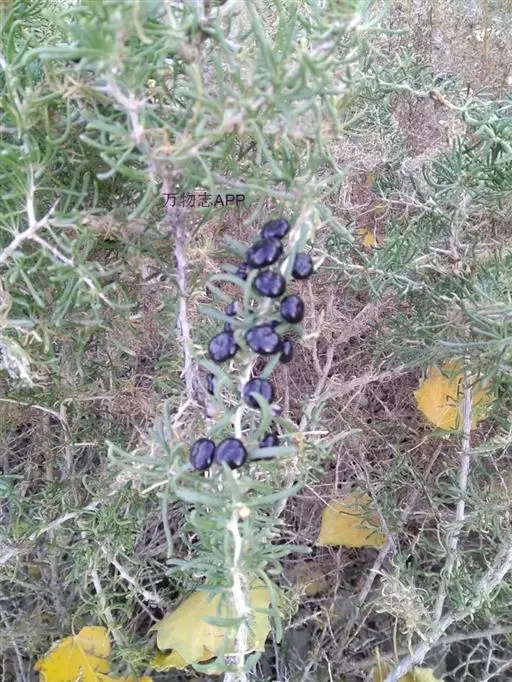 黑果枸杞 多棘刺灌木,高20-50(-150)厘米,多分枝;分枝斜升或横卧于地面,白色或灰白色,坚硬,常成之字形曲折,有不规则的纵条纹,小枝顶端渐尖成棘刺状,节间短缩,每节有长0.3-1.5厘米的短棘刺;短枝位于棘刺两侧,在幼枝上不明显,在老枝上则成瘤状,生有簇生叶或花、叶同时簇生,更老的枝则短枝成不生叶的瘤状凸起。叶2-6枚簇生于短枝上,在幼枝上则单叶互生,肥厚肉质,近无柄,条形、条状披针形或条状倒披针形,有时成狭披针形,顶端钝圆,基部渐狭,两侧有时稍向下卷,中脉不明显,长0.5-3厘米,宽2-7毫米。