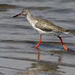 红脚鹬:体长28厘米,上体褐灰,下体白色,胸具褐色纵纹。飞行时腰部白色明显,次级飞羽具明显白色外缘。…