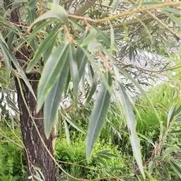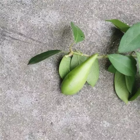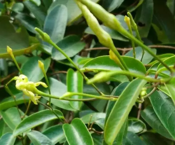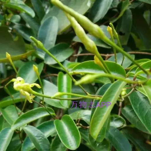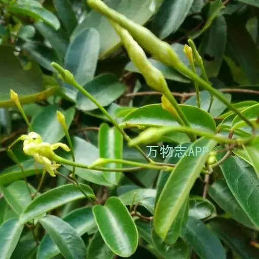 白叶藤 柔弱木质藤本,具乳汁;小枝通常红褐色,直径约1毫米,无毛。叶长圆形,长1.5-6厘米,宽0.8-2.5厘米,两端圆形,顶端具小尖头,无毛,叶面深绿色,叶背苍白色;侧脉纤细,每边5-9条;叶柄长5-7毫米。聚伞花序顶生或腋生,比叶为长;花蕾长圆形,顶端尾状渐尖;花萼裂片卵圆形,长1毫米,花萼内面基部有10个腺体;花冠淡黄色,花冠筒圆筒状,长5毫米,花冠裂片长圆状披针形或线形,比花冠筒长2倍,向右覆盖,顶端旋转;副花冠裂片卵圆形,生于花冠筒内面;花粉器匙形,粘于柱头上;心皮离生,无毛,花柱短,柱头宽圆锥状。蓇葖长披针形或圆柱状,长达12.5厘米,直径6-8毫米;种子长圆形,长约1厘米,宽2毫米,棕色,顶端具白色绢质种毛。花期4-9月,果期6月-翌年2月。