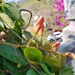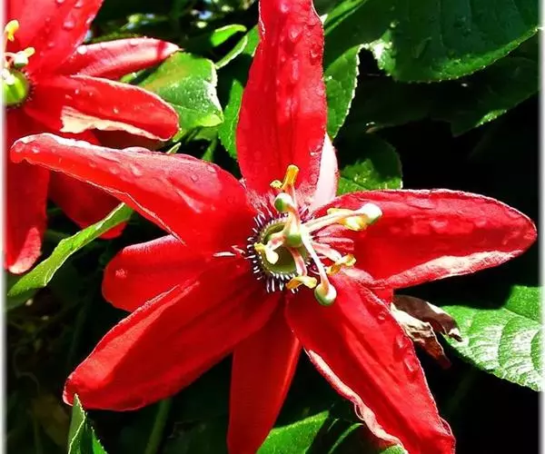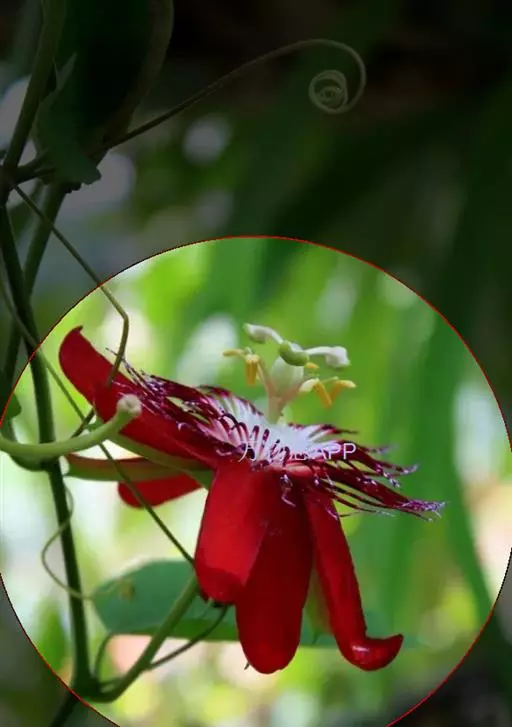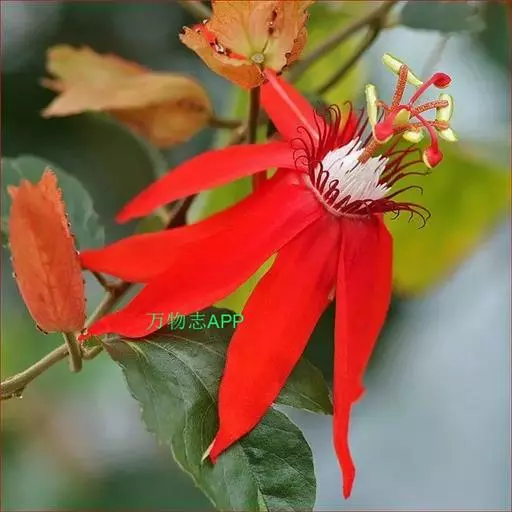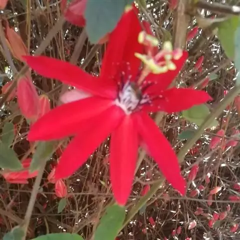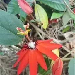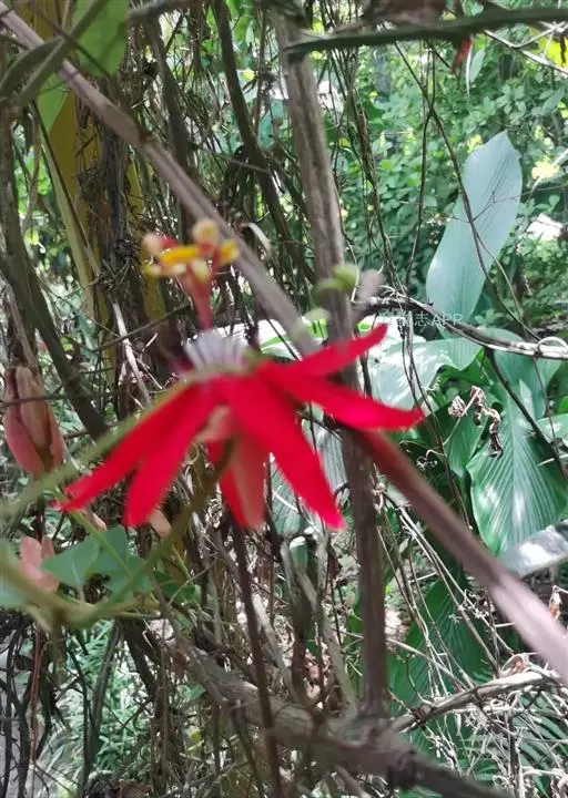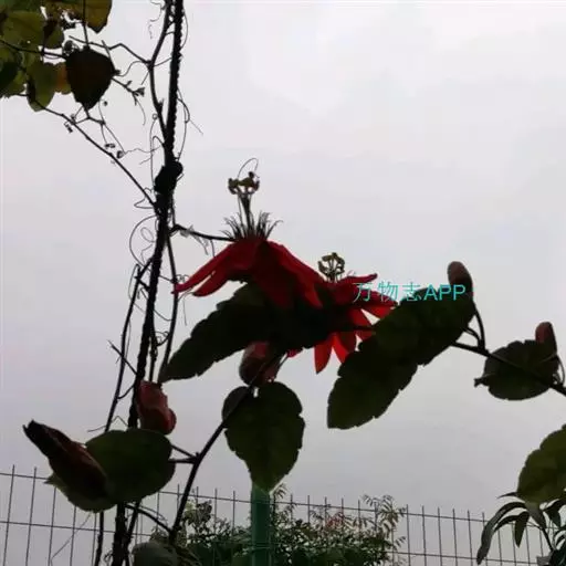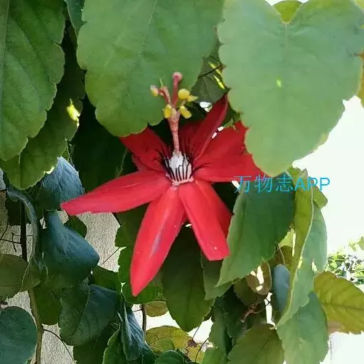 红花西番莲(Passiflora coccinea Aubl.) ,又名洋红西番莲,是西番莲科,西番莲属 的多年生常绿蔓性藤本植物,蔓长可达数米。幼茎近圆形,老茎三棱形。叶互生,长卵形。花单生于叶腋,花瓣长披针形,先端微急尖,稍外向下垂,红色。副花冠3轮,最外轮较长,紫褐色并散布有斑点状白色,内两轮为白色。果卵圆形。