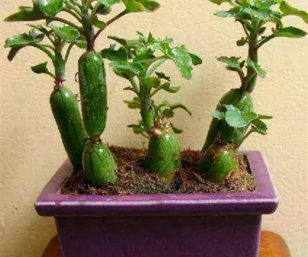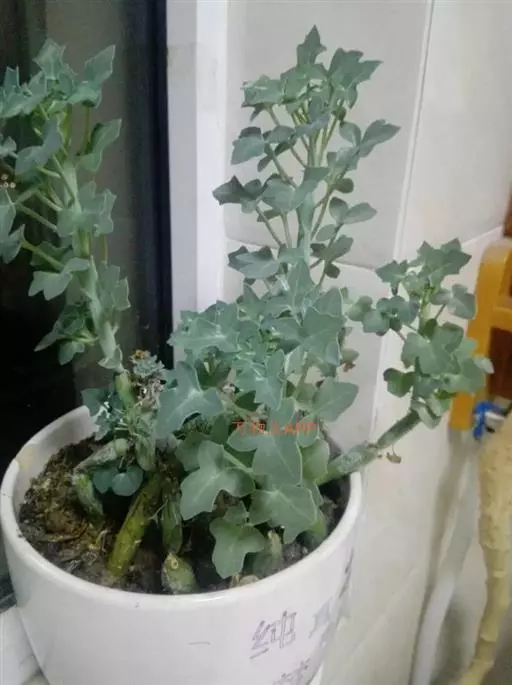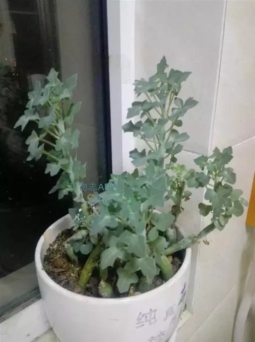 多年生常绿多肉植物。株高一般为30-60厘米,全株被白粉。茎短圆柱状,具节,节处较细,节间膨大,每节长5-15厘米,粉蓝色,顶端密生肉质小叶。叶扁平,深绿色,提琴状,羽状3-5深裂。长5厘米,叶柄与叶片等长或更长。冬、春开花,头状花序,花径1.2厘米左右,黄色,花期在7-10月之间。