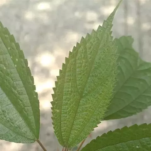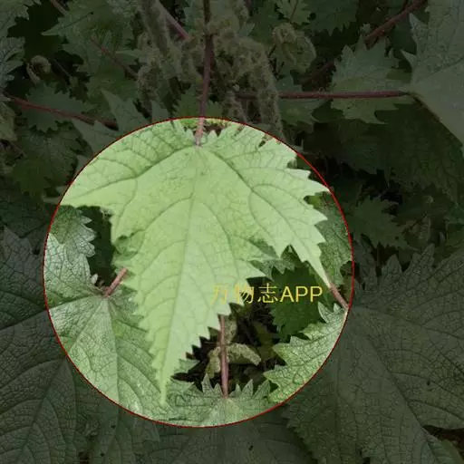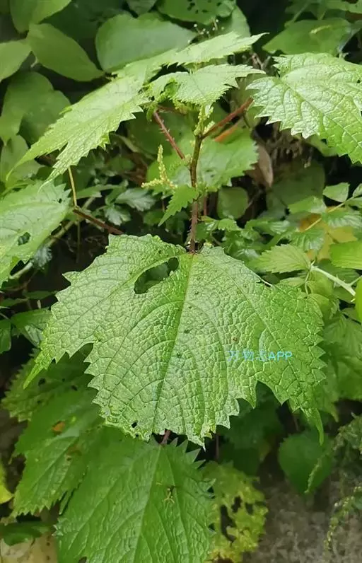 一年生草本。茎高30-100厘米,麦秆色或紫红色疏生刺毛和细糙伏毛,几不分枝。叶膜质,宽卵形或近圆形,长5-19厘米,宽4-18厘米,先端短尾状或短渐尖,基部近圆形、截形或浅心形,稀宽楔形,边缘有8-13枚缺刻状的粗牙齿或重牙齿,稀在中部3浅裂,上面疏生纤细的糙伏毛,下面有稀疏的微糙毛,两面生很少刺毛,基出脉3,侧脉3-5对,稍弧曲,在边缘处彼此不明显的网结;叶柄长2-11厘米,疏生刺毛和细糙伏毛;托叶披针形或三角状披针形,荨长6-10毫米,外面疏生细伏毛。