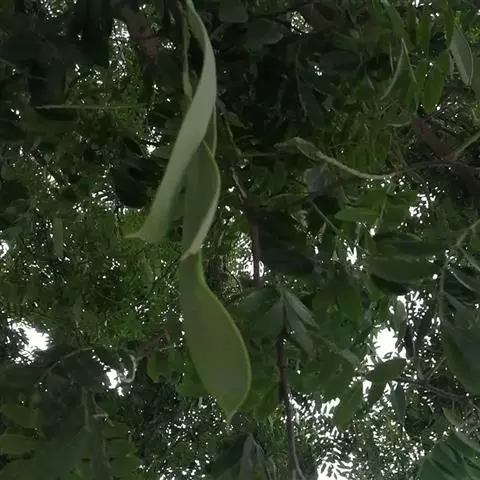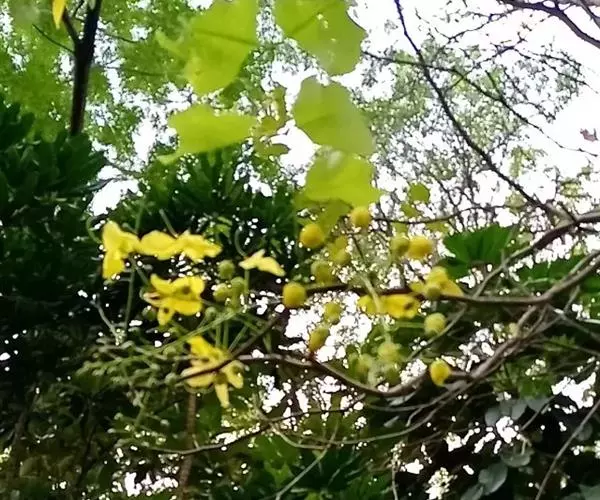 腊肠树(学名:Cassia fistula L.):落叶乔木,高可达15米;枝细长;树皮灰色,老时粗糙,暗褐色。叶长30-40厘米,小叶对生,薄革质,阔卵形,卵形或长圆形,边全缘,幼嫩时两面被微柔毛,老时无毛;叶脉纤细,两面均明显。总状花序长达30厘米或更长,疏散,下垂;花与叶同时开放,直径约4厘米;花瓣黄色,倒卵形,近等大,具明显的脉。荚果圆柱形,长30-60厘米,黑褐色,不开裂,有槽纹;种子40-100颗,横隔膜所分开。花期6-8月;果期10月。