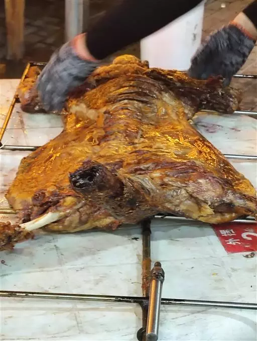 烤羊腿是呼伦贝尔招待宾客的一道佳肴名菜。烤羊腿是从烤全羊演变而来。经过长期的发展,在羊腿烘烤过程中逐步增加了各种配料和调味品,使其形、色、味、鲜集一体,色美、肉香、外焦、内嫩、干酥不腻,被人们赞为"眼未见其物,香味已扑鼻"。